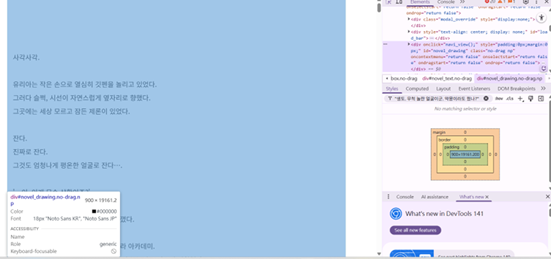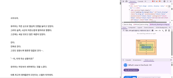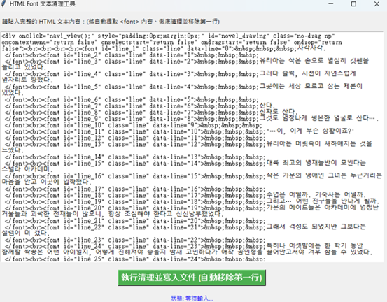 之後將複製的元素區塊貼到隨便一個去除html格式的工具或網站,便能得到乾淨的文本,但通常廣泛網站不會做特別處理,頂多用去除格式的函式庫工具進行去除,因此容易有多餘的東西包含在內,尤其是novelpia這種專為干擾爬蟲做特化的網站更容易,因此自己有做了一個工具,針對novelpia常用的干擾用多於元素進行處理,因此不會有多餘的標籤或元素在內文裡,而且往後若有新的阻擋型多餘標籤,我也能夠靈活對程式碼進行修改。以下為演示
