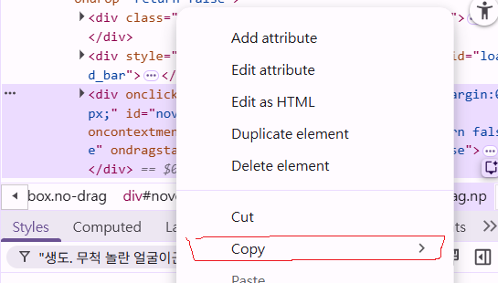 選中後,在右邊的檢查器區塊按下右鍵選擇copy中的copy element複製整個元素區塊,如下圖