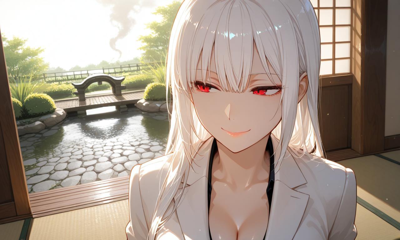 身穿白色西裝,且有著同色髮絲的女人坐在拉門外,背對著捷德與凱文兩人。她望著眼前綠意盎然的庭院,草木、石橋以及發出規律敲擊聲的驚鹿,皆包含於其中。