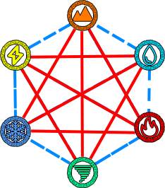 以攻击为主要目的的魔术,分为火、水、冰、土、风、雷六种,不同属性间会存在抑制或提升关系,普通人往往擅长关系互相提升的属性。(如图,红线为相辅关系,蓝色为互斥关系)