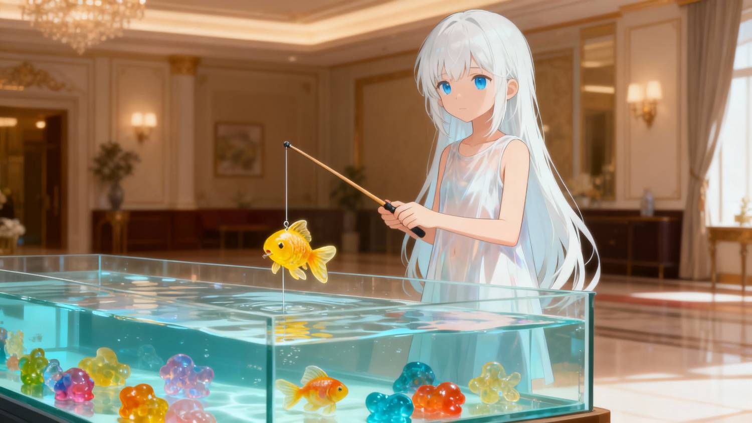 米卡放下釣竿,伸出小手,掌心向下滑過水面,隨著她的動作,五顏六色的果凍金魚在她掌下憑空出現,並躍入水中,濺起一陣陣水花。