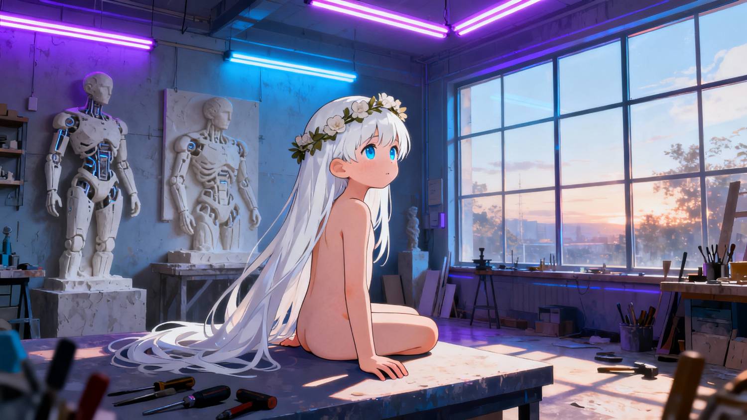 歪了歪並不痠痛的脖子,米卡環視工坊,想看看還有沒有新奇的事物,結果就和藍髮少女對上了眼。