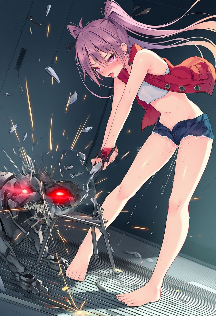 我扔下变形的椅子,呼吸像风箱一样拉扯着。汗水顺着颈侧滑下,滴进抹胸与皮肤的夹缝,带来一阵冰凉,却立刻被胸前两点传出的灼热盖过。
