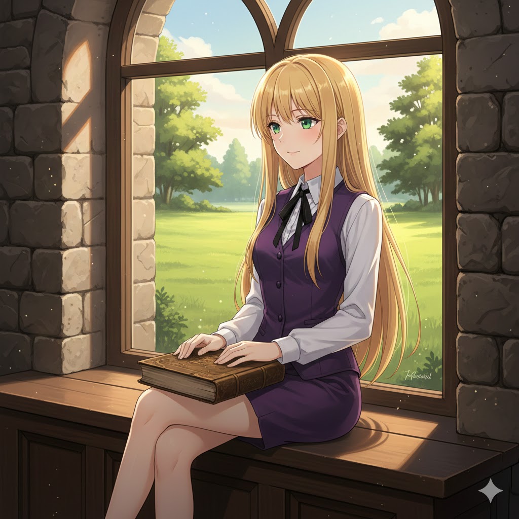 一页一页的翻阅着手上书籍的依文洁琳,在听到了紫礼貌但又带点平静般的回应后,指尖停在纸页边,随即转过身去,看向坐在桌前的紫——目光短暂打量,而紫只是不疾不徐地维持着那份安静的微笑