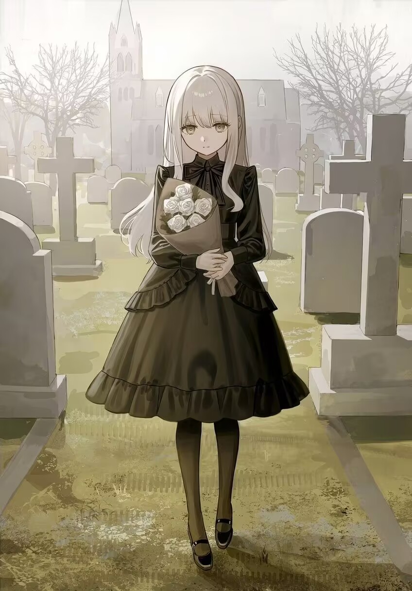 身着丧服的少女立于身前,将她与她所恐惧的世界分隔。
