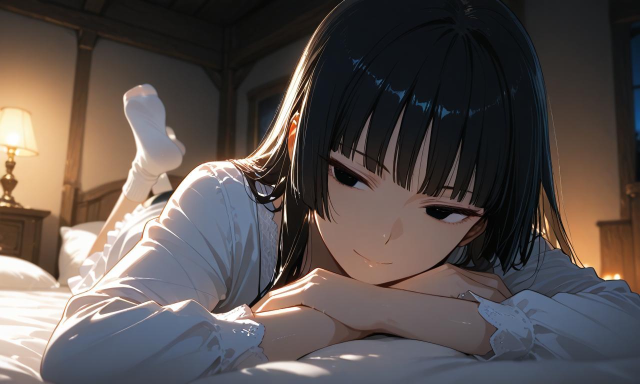 澪穿著白襯衫,下身只穿著黑色的內褲,潔白的雙腿舒適的癱在床上,腳上穿著白襪。她的髮絲微微濕潤,臉枕在雙手上,黑色雙眸中雖然透著疲憊,但看到搭檔時,還是擠出一個淡淡的笑。