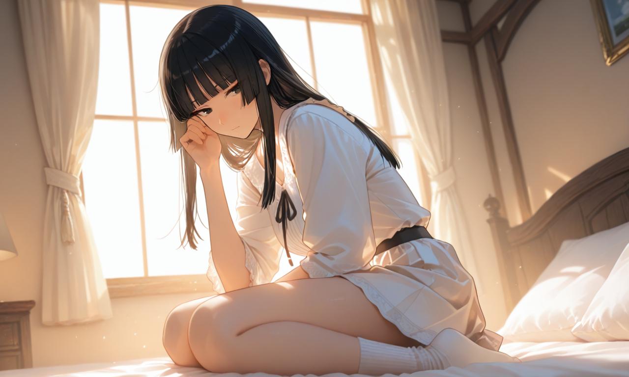 澪一屁股的坐在床墊上,雙腿朝兩側分開,一手揉著眼睛,看上去似乎仍帶著一點睡意。