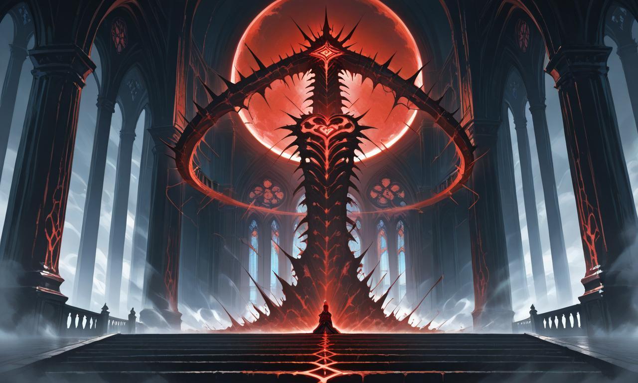 主殿中央,巨大的祭壇矗立著。看起來就像從地底竄出的脊柱,成束的尖刺沿著表面向外張開,頂端則是一顆被環形結構圍繞的心型雕塑。其上是巨大的赤色圓球,如同太陽一般,讓室內沐浴在其腥紅的光芒之下。