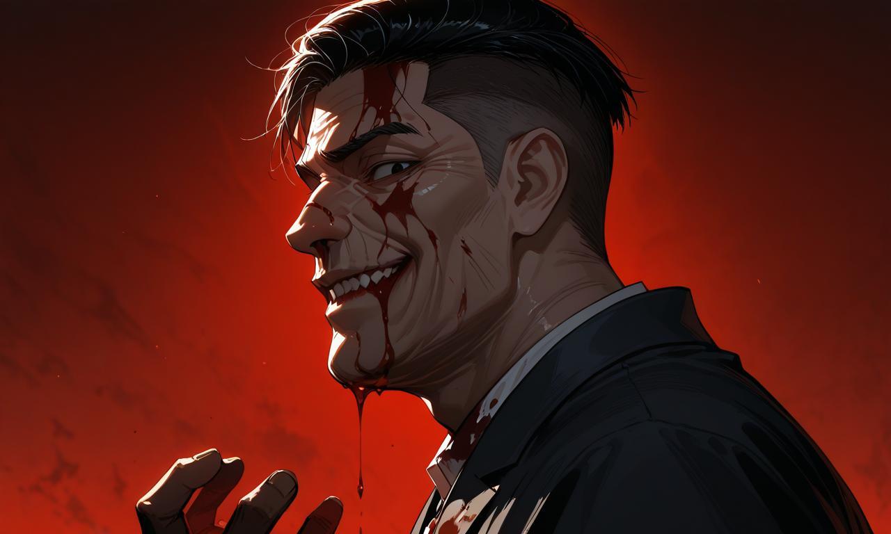 此時,手機的聲響自浩太胸前的口袋發出,他隨意在西裝褲上抹去血跡,取出手機,指尖在螢幕上游移片刻後,臉上的笑容逐漸擴大。